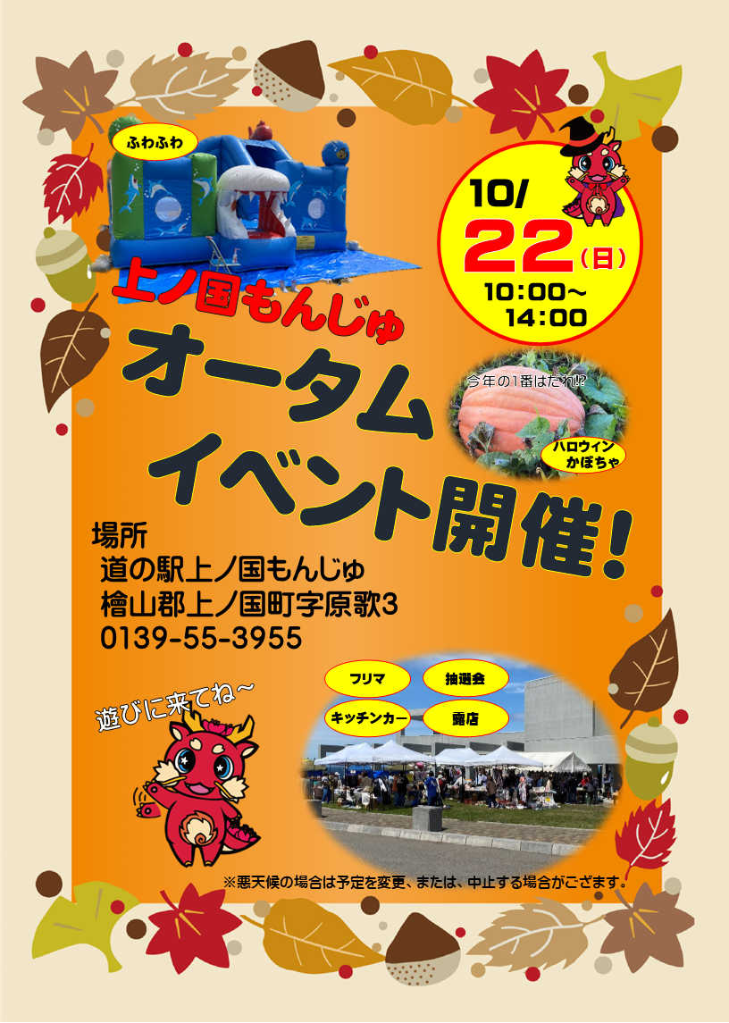 10/22(日)予定のオータムイベントは天候等の事情により、下記の通り一部変更となります。