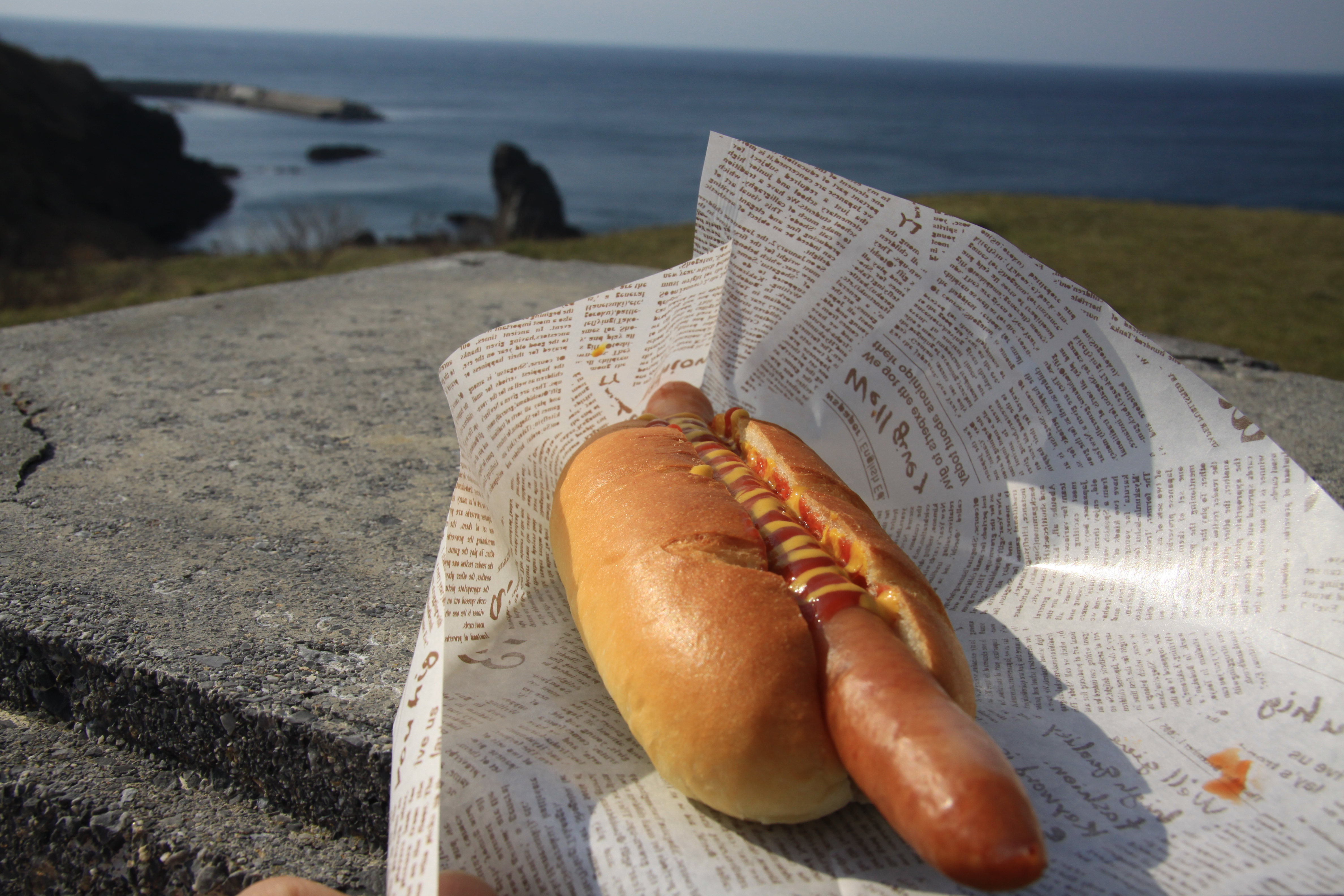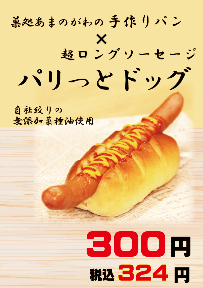 菓処あまのがわが手作りで作ったパンと自社で種から絞った無添加菜種油を使い、25cm大の超ロングソーセージを挟んだホットドッグです。